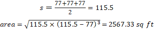 At this point in time, through extreme effort and perseverance, the farmer has finally sold his 21,780 sq ft plot of land and has decided to use some of the money earned to build a pool for his family. Unfortunately for the farmer, he does not consider the fact that the maintenance costs of a pool for one year alone could likely pay for his children to visit any pool or water theme park for years to come. Even more unfortunately for the farmer, his 7-year-old daughter who has recently traveled to Egypt vicariously through Dora the Explorer, has fallen in love with triangles, and insists that the pool not only be triangular in shape, but also that the measurements must only include the number 7, to represent her age and immortalize this point of her life in the form of a triangular pool. Being a doting father, the farmer acquiesces to his daughter's request and proceeds to plan the construction of his triangular pool. The farmer must now determine whether he has sufficient area in his backyard to house a pool. While the farmer has begun to learn more about SI units, he is as yet uncomfortable with their use and decides that his only viable option is to construct a pool in the form of an equilateral triangle with sides 77 ft in length, since any other variation would either be too large or small. Given these dimensions, the farmer determines the necessary area as follows: