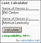 This love calculator evaluates the compatibility of two people based on names. The score range from 0%-100%. The higher the score the better, eg. Bill Clinton vs. Monica Lewinsky has a score of 90%. This calculator can be inserted either to the sidebar or into the post, but not both.